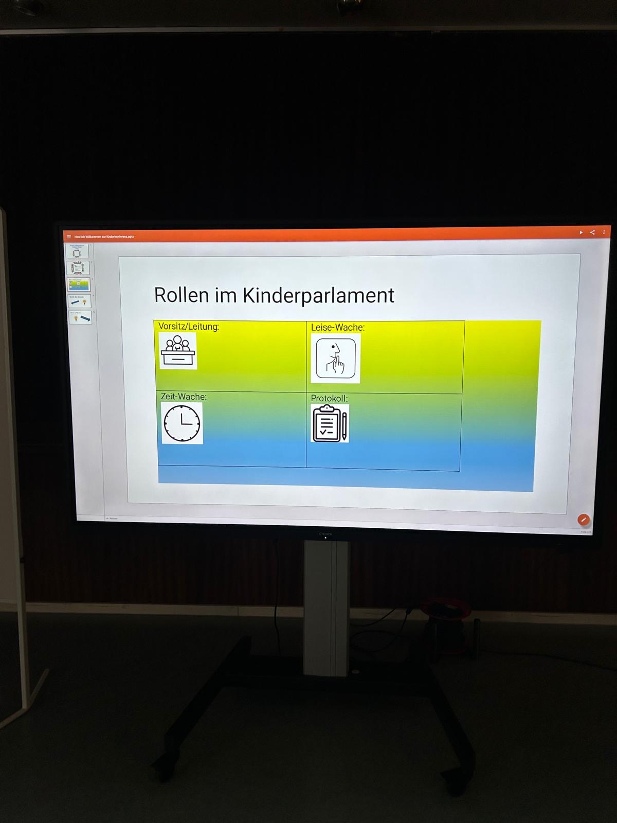 Die Tagesordnung wird von den Kinder mitgestaltet und geprägt. Die Klassensprecherinnen und Klassensprecher übernehmen abwechselnd drei Ämter (Protokollführer*in, Zeitwächer*in, Vorsitzender*e)  und erhalten durch die begleitende Lehrkraft Unterstützung bei der Durchführung. Alle Ergebnisse werden in einem vorstrukturierten Protokoll festgehalten. Die Kinderkonferenz findet alle 6-8 Wochen statt.