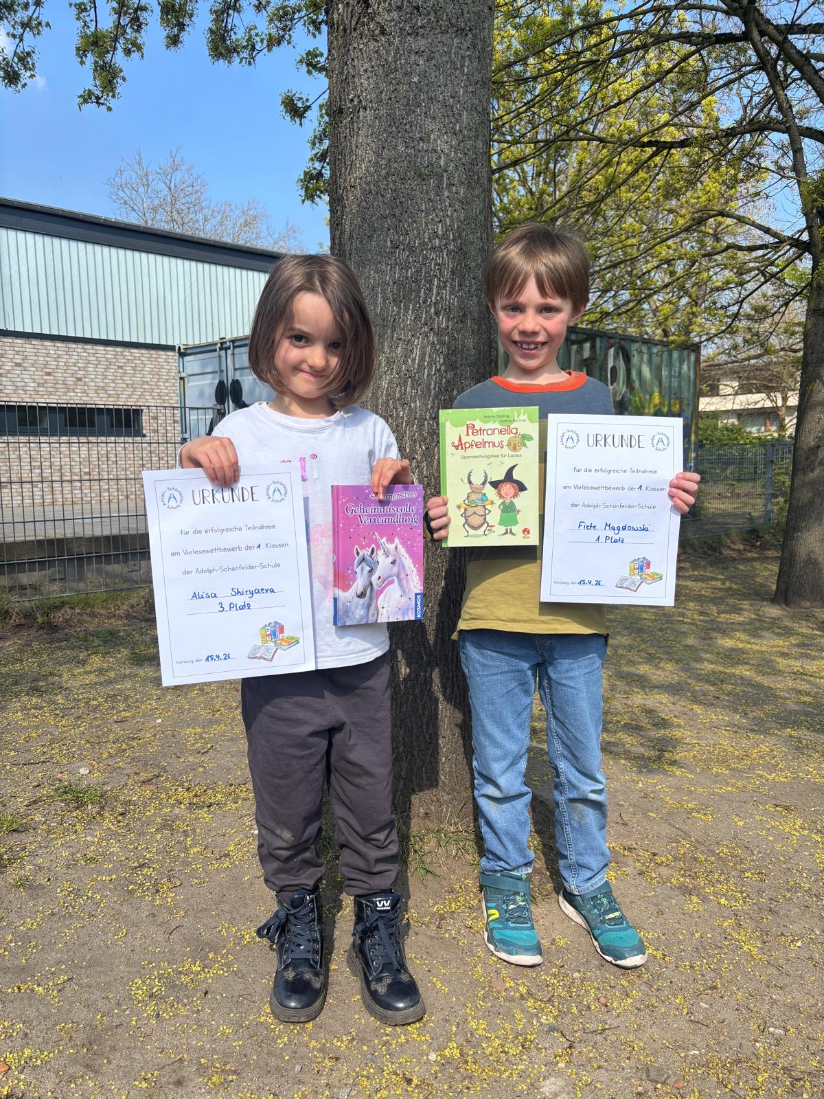 Die Gewinner der Plätze 1-3 durften sich ein schönes Buch aussuchen. Gewinner war letztlich aber ein jedes Lesekind, denn alle machten die Erfahrung, vor einem ganzen Jahrgang mit Mikrofon vorzulesen und einen großen Applaus zu bekommen. Außerdem bekamen sie eine Urkunde und ein ASS-Lesezeichen.