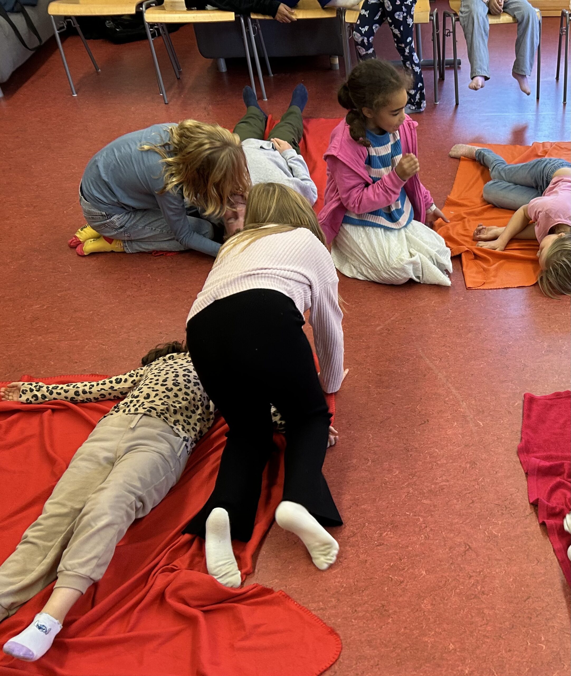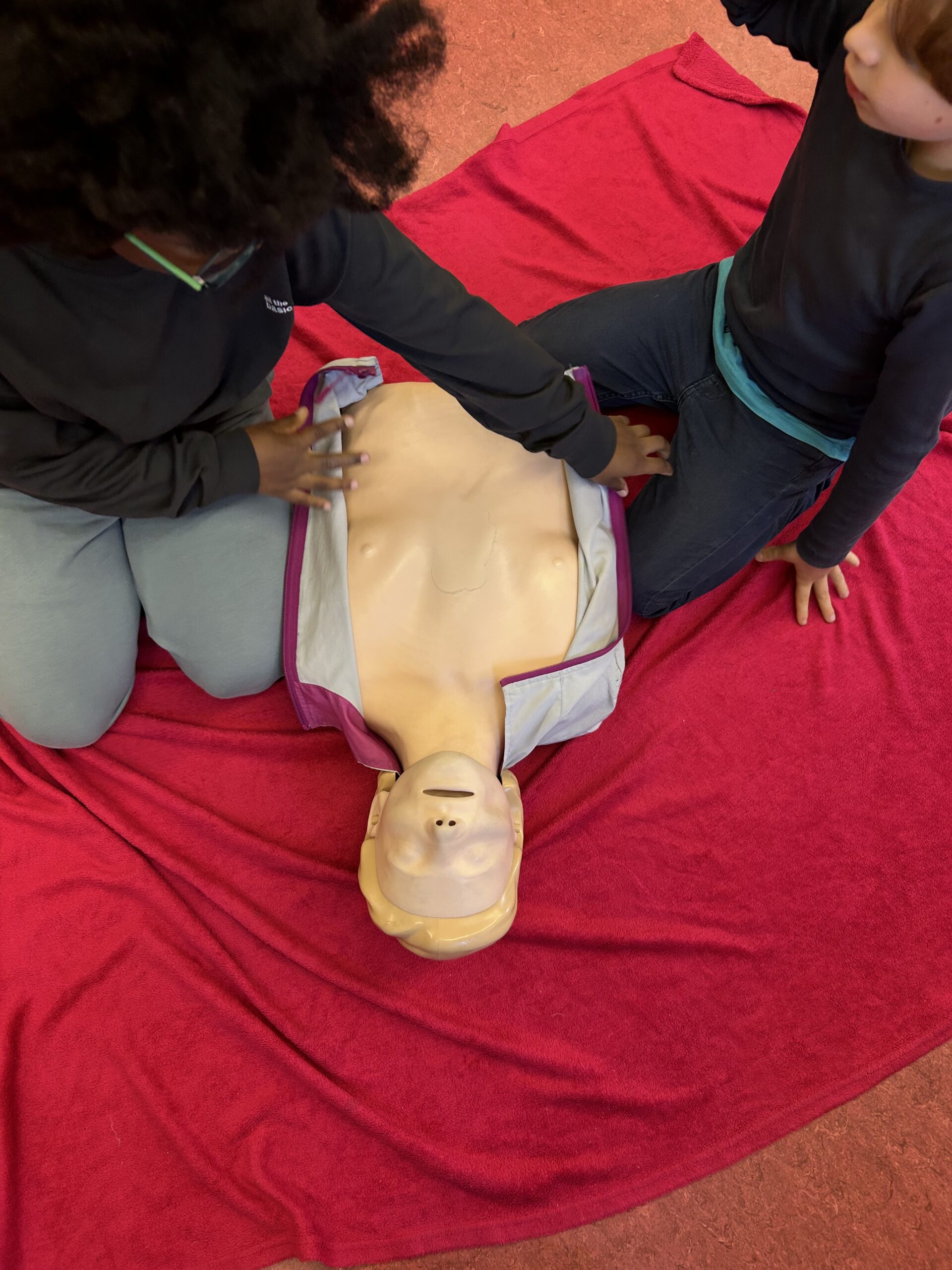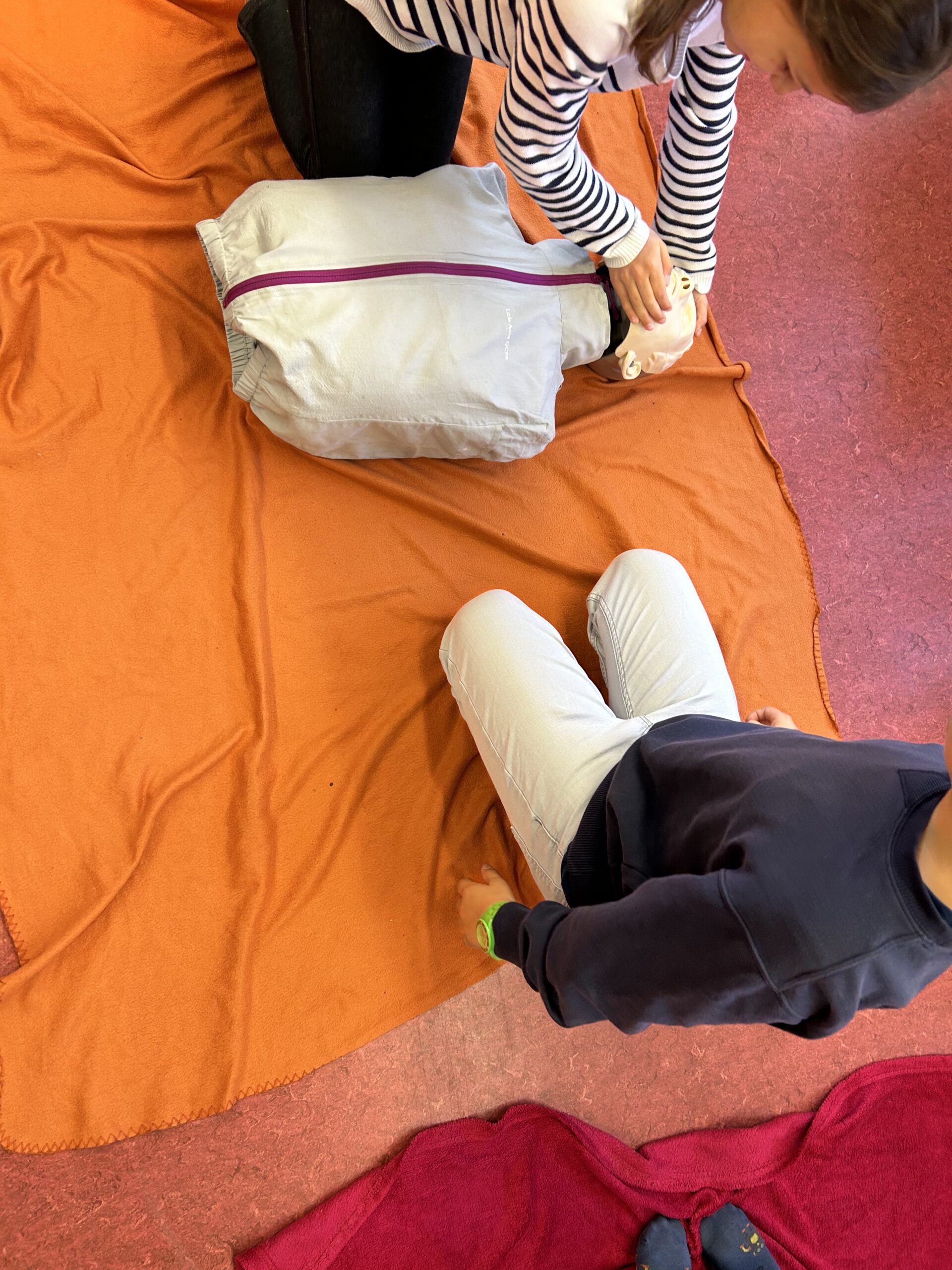 Die dritten Klassen der Zeisigstraße haben Herzretter-Training und lernen, was man im Falle eines Herzinfarktes/Herzstillstandes als Erste-Hilfe-Maßnahme machen kann. In Zweiergruppen trainieren die Kinder aneinander, an den Puppen (sogar mit Trainings-Defibrillator) und spielen das Absetzen eines Notrufs mit der Leitstelle der Feuerwehr durch. Am Ende gibt es einen Herzretter-Pass, auf dem die wichtigsten Schritte der Ersten Hilfe auch nochmal stehen – für zu Hause, für das Federmäppchen oder den Sportverein. Denn Erste Hilfe kann immer und überall nötig werden.