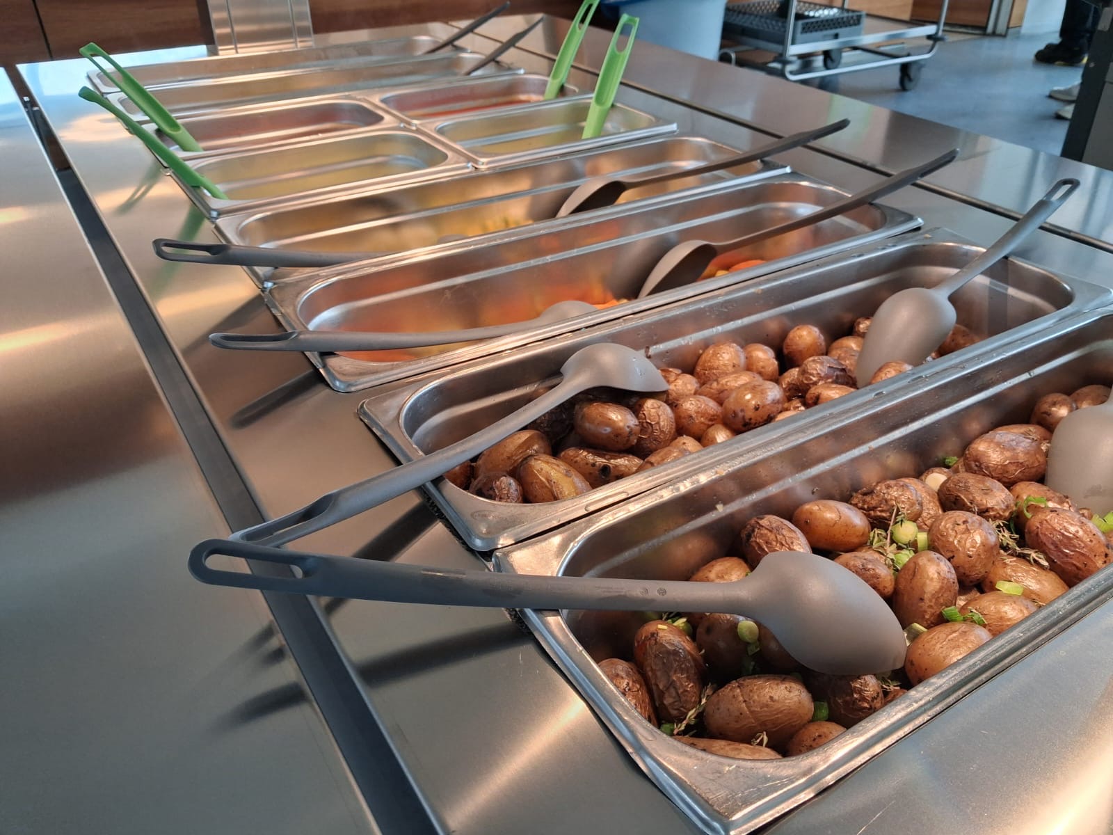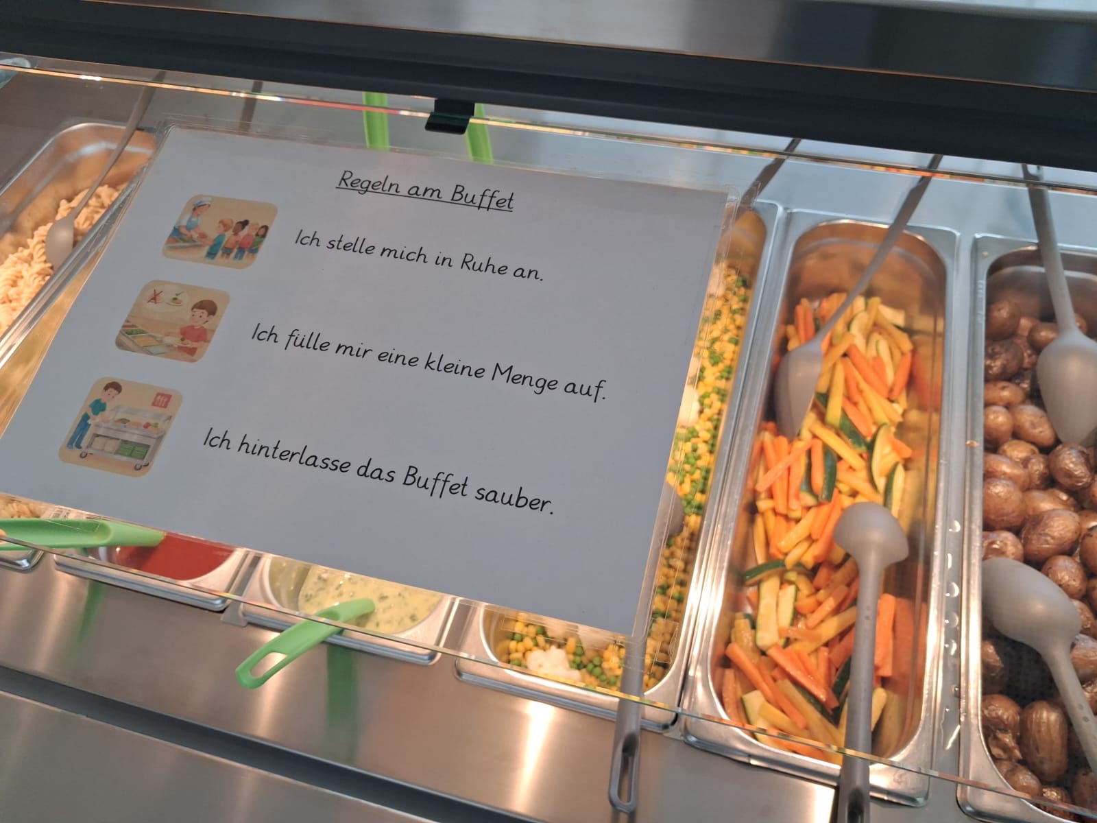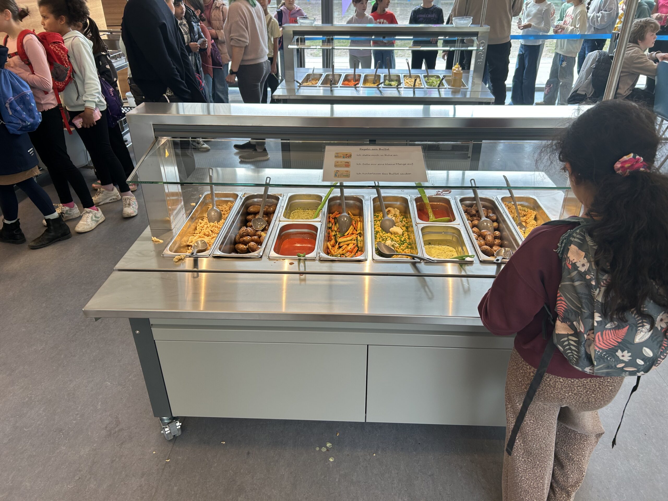 Mit großer Freude haben wir heute unser neues Free-Flow-Buffetsystem in der Mensa eingeführt. Dank unserer neuen Buffetwagen können die Kinder ihre Mahlzeiten nun noch selbstständiger, flexibler und bewusster auswählen.